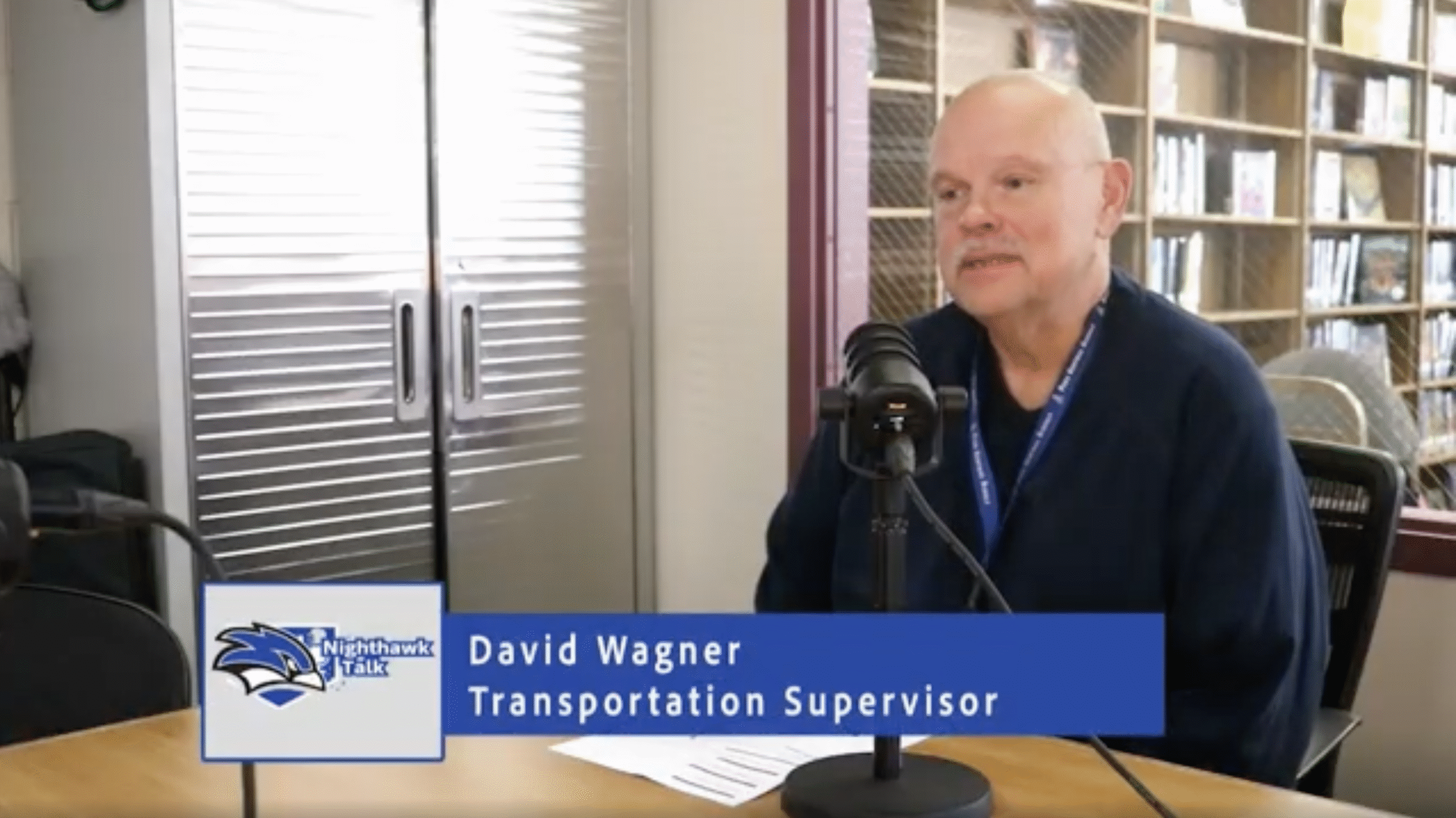 6th grader Grace Wheatley visits with Transportation Manager David Wagner to learn more about the school’s transportation department including the daily life of a bus drive and new software that helps families know when the buses should be arriving to pick up students.